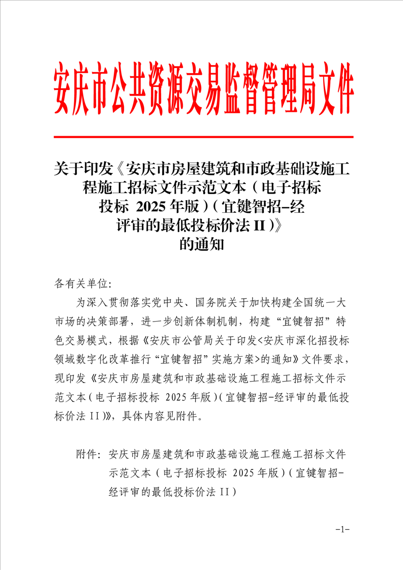 关于印发《安庆市房屋建筑和市政基础设施工程施工招标文件示范文本(电子招标投标 2025年版)(宜键智招-经评审的最低投标价法II)》的通知